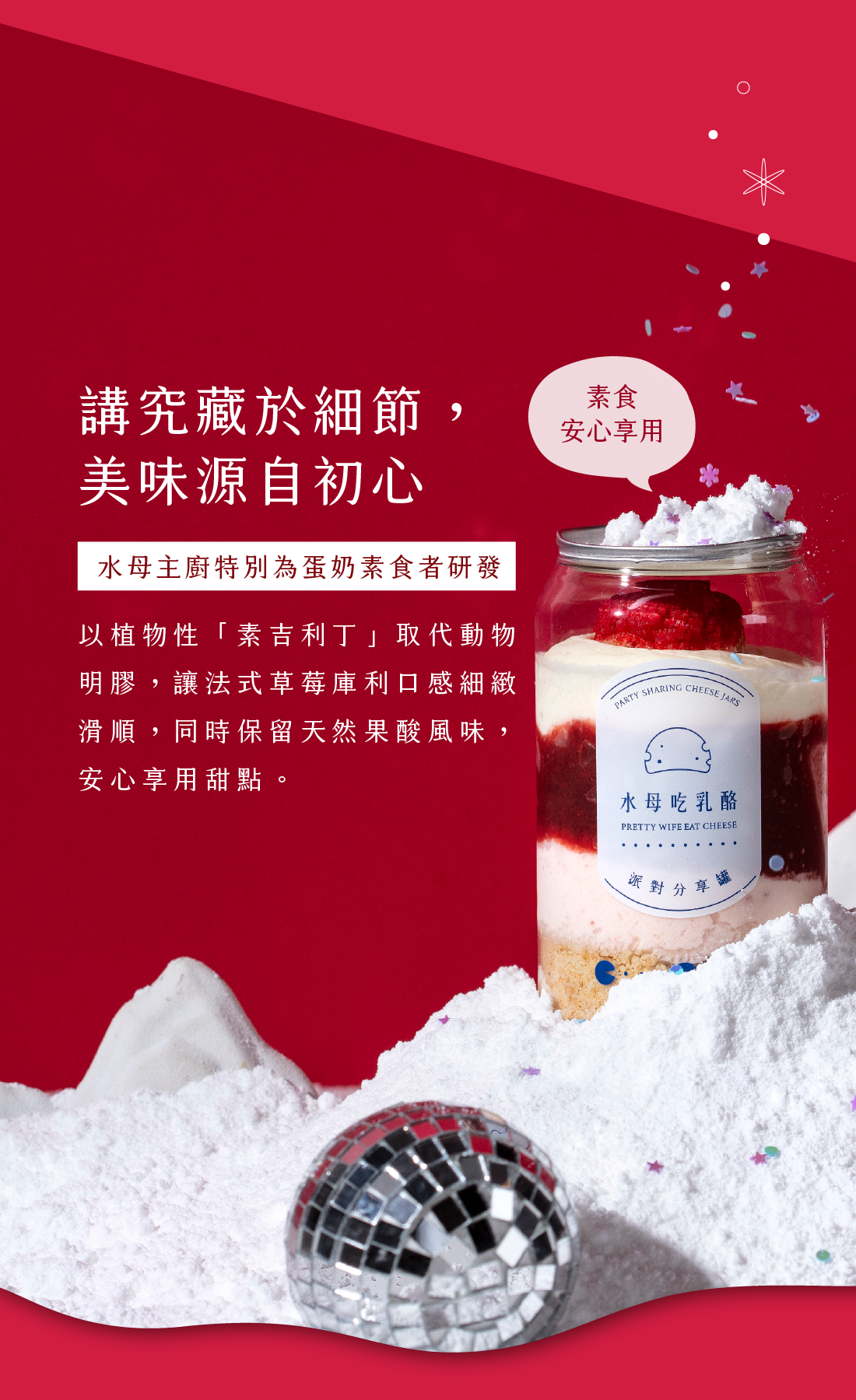 水母吃乳酪罐罐蛋糕,透明罐造型甜點,口感細緻不膩口。一次推出三種人氣口味:比利時草莓製作的草莓罐罐、濃郁堅果香的開心果罐罐,以及結合台東鹿野紅烏龍與義大利香水蜜桃的蜜桃烏龍罐罐。層次豐富、外型吸睛,適合送禮與日常享用。