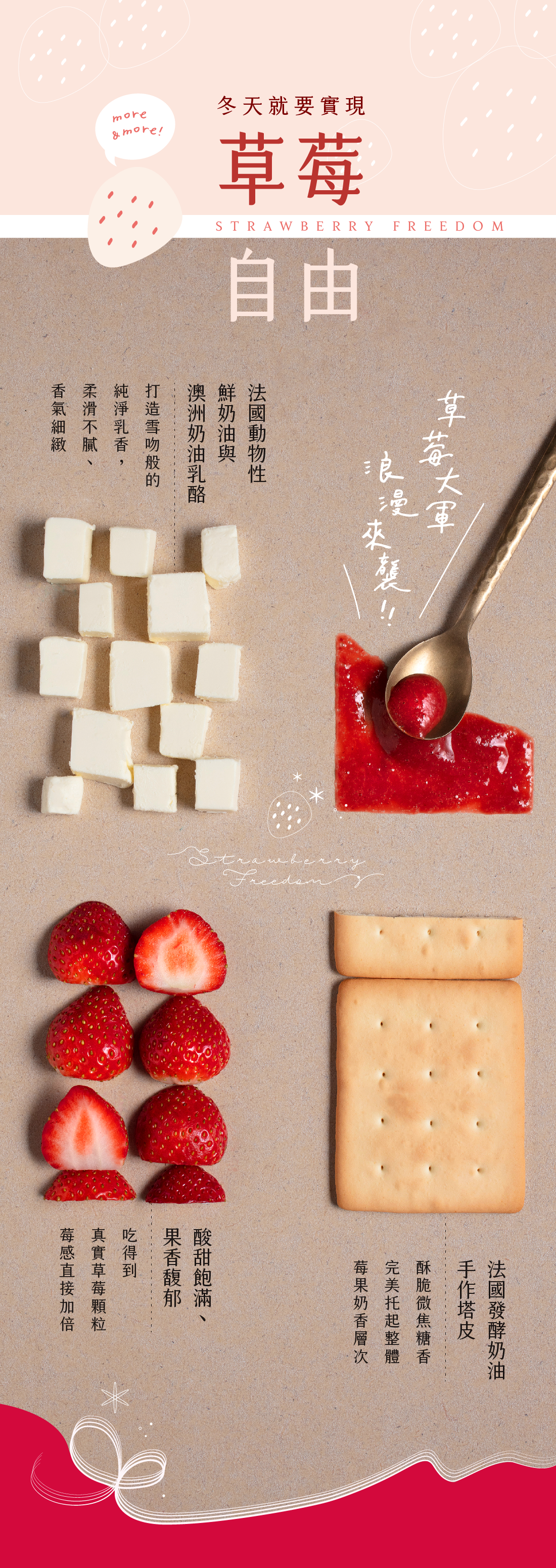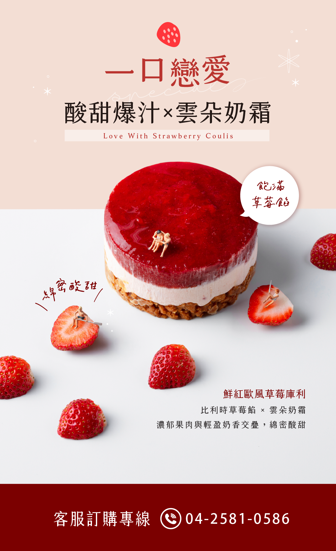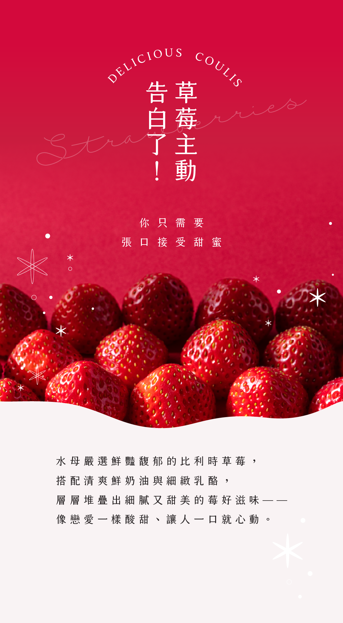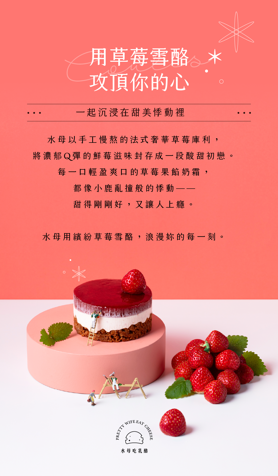 水母吃乳酪草莓奶霜,以果肉含量 80% 以上的比利時草莓製作,酸甜清新。柔滑乳酪奶霜搭配焦糖脆餅底,口感細緻又有層次。外型溫柔、風味不膩,是適合送禮、也適合犒賞自己的療癒系草莓甜點。